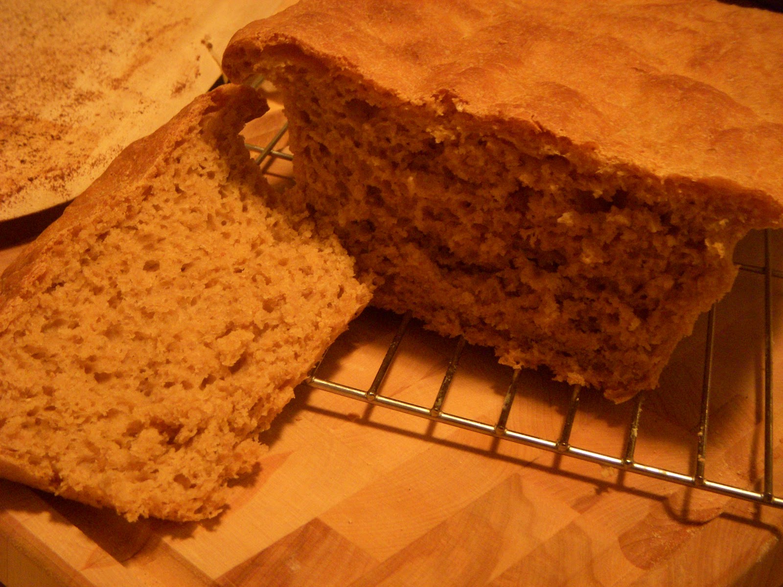 Well this didn't turn out at all how I thought it would. I should have been worried after the second rise - the dough rose so high above the top of the pan that I thought it was going to collapse onto itself. After 10 minutes of baking, some of it had actually dripped down onto the bottom of the oven. Thank goodness I caught it before anything started burning. After less than 20 minutes, the top of the bread was completely brown and hard, so I took it out. I let it cool on a wire rack, in the pan for a while, and then took it out. The bottom of the loaf was soggy and spongy. I'm thinking I'm going to have to toss it.